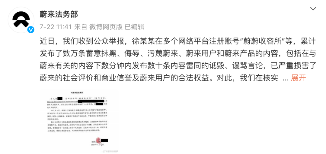 7月22日,蔚来法务部微博发文称收到公众举报,徐某某在多个网络平台注册账号“蔚蔚收容所”等,累计发布了数万条蓄意抹黑、侮辱、污蔑蔚来、蔚来用户和蔚来产品的内容,包括在与蔚来有关的内容下数分钟内发布数十条内容雷同的诋毁、谩骂言论,已严重损害了蔚来的社会评价和商业信誉及蔚来用户的合法权益。