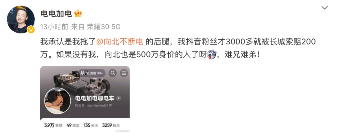 其中,“向北不断电”是被长城汽车起诉账号中热度较高的,微博粉丝19.9万,抖音粉丝39.0万,其长期发布与比亚迪汽车相关的视频。