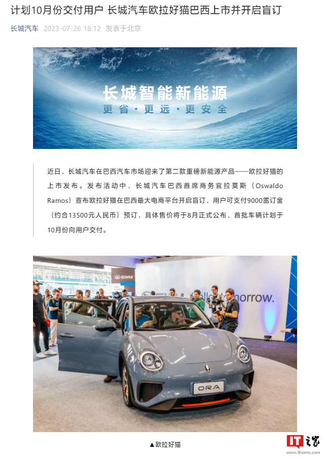 IT之家 7 月 27 日消息,据长城汽车官方公众号 7 月 26 日消息,长城汽车旗下纯电小型车欧拉好猫已在巴西上市。长城汽车巴西首席商务官 Oswaldo Ramos 宣布,新车将在巴西最大的电商平台开启盲订,订金为 9000 雷亚尔(约 13500 元人民币),具体售价将于 8 月正式公布,首批车辆 10 月展开交付。