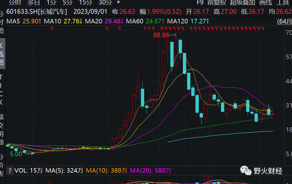 在二级市场上,2021年10月,长城汽车的股价曾涨至68元以上,至9月3日还剩不到27元,腰斩不止;最新市值2262亿元,依旧是河北省内市值最高的A股上市企业,且高于上汽、广汽和长安,但远远低于比亚迪。