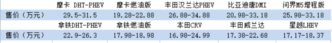 以摩卡为例,摩卡DHT PHEV车型定价29.5-31.5万,不仅高出燃油版约10万元,而且大幅高于同级别竞品比亚迪唐DM、问界M5增程版、丰田汉兰达PHEV等车型。