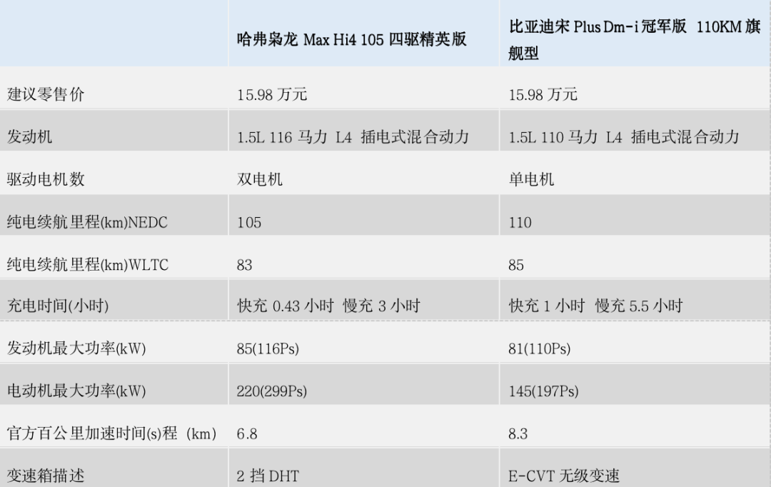 哈弗枭龙 Max 与比亚迪宋 PLUS DM-i 性能对比