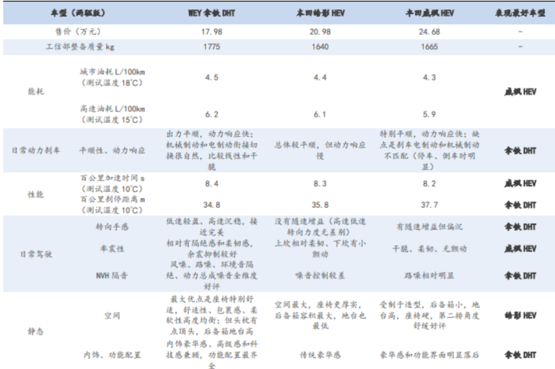 从产品性能和口碑上看,长城汽车的混动产品在能耗、性能、NVH、智能化等方面表现都非常优异。根据38号车评中心的测评,拿铁DHT和本田皓影HEV、丰田威飒HEV的油耗水平相当,在驾驶平顺性、动力响应、百公里刹停距离、NVH 隔音等方面表现均胜出,拿铁 DHT 内饰兼具豪华感和科技感,功能配置更齐全,起售价17.98万元,性价比明显高于本田皓影HEV和丰田威飒HEV。
