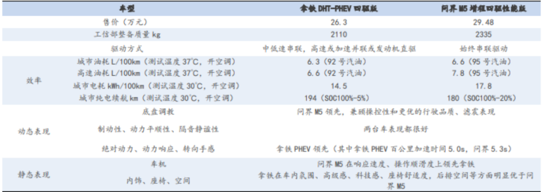 而根据38号车评中心22年8月的测评,拿铁PHEV的高速油耗以及城市电耗均明显低于问界M5增程版,并且拿铁PHEV可以加92号汽油,经济型显著。此外,拿铁PHEV在制动性、平顺性和隔音静谧性上表现较好,而在绝对动力、动力响应和转向手感方面领先问界M5。