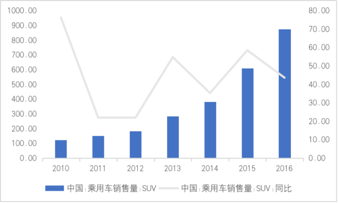 轿车市场的失利,让长城汽车彻底改变了战略。2010-2017年,正值我国SUV高速发展的黄金时期,在这个阶段我国SUV的销量从123万辆增长至1007万辆,七年累计增长了880万辆,年均复合增速约为35%。与此同时,SUV 车型在国内乘用车的销量占比也从2010 年的 10%大幅上升到 2017 年的 37%,成为我国乘用车市场的主要增量。