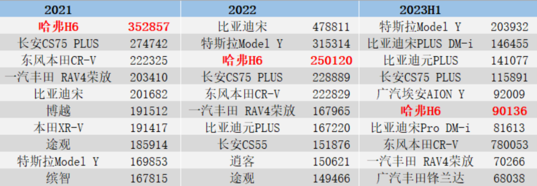 最终在新能源爆款车型的缺失下,使得长城汽车品牌新能源渗透率与乘用车市场迅速拉大,2022年我国乘用车市场的新能源渗透率已经达到28%,而长城汽车的新能源渗透率则仅为11%。而在今年上半年的SUV销量前十榜单中,特斯拉和比亚迪分别摘取冠亚军,而曾经的王者哈弗则落到了第六名的位置。