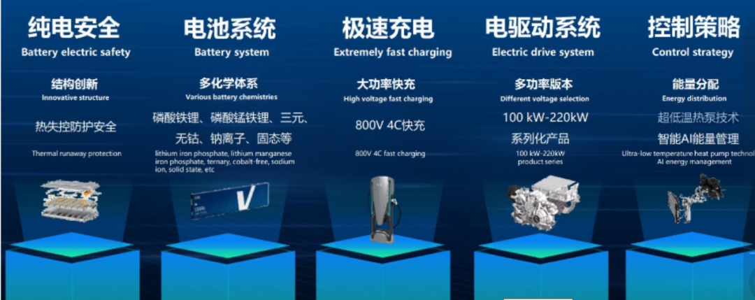 在纯电领域,长城汽车与旗下丰巢科技深度绑定,全面布局纯电安全、电池系统、极速充电、电驱动系统与控制策略五大技术方向。蜂巢能源在电池系统上实现了三元、磷酸铁锂、无钴等主流技术布局,同时储备了钠离子电池、磷酸锰铁锂、全固态等前沿技术路线,同时,在极速充电上,长城汽车推出800V 高压快充技术,蜂巢能源正在开发长薄化4C快充三元电芯,可实现 20-80% SOC快充时间10分钟;