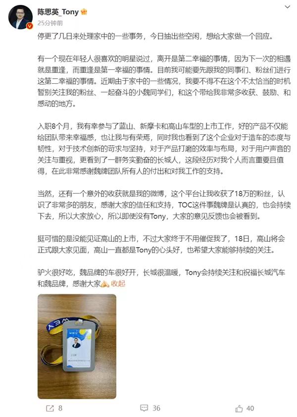 日前,据EV视界了解到,汽车魏品牌兼&魏营销总经理陈思英在社交平台宣布,因家庭原因告别长城汽车。