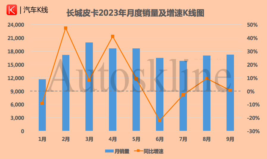 值得注意的是,长城皮卡销量增速大幅回落或与市场行情不无关系。中汽协数据显示,今年前9个月,中国皮卡销量为38.2万辆,同比下滑1.8%。