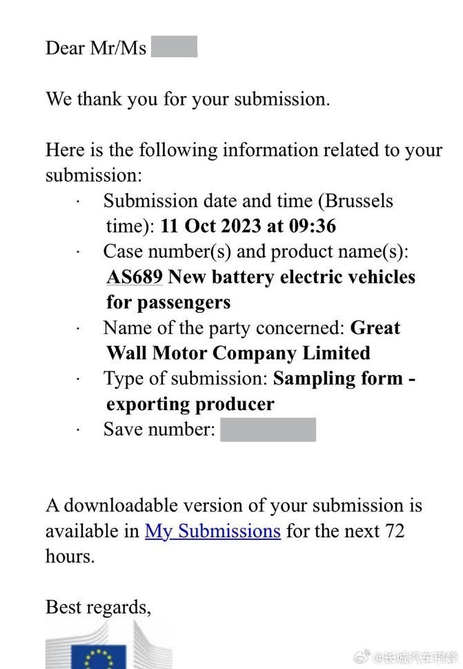 10月23日,长城汽车总裁穆峰在微博表示:“对于欧盟反补贴调查,长城汽车率先应对,已经于本月11日第一个提交应对材料。”