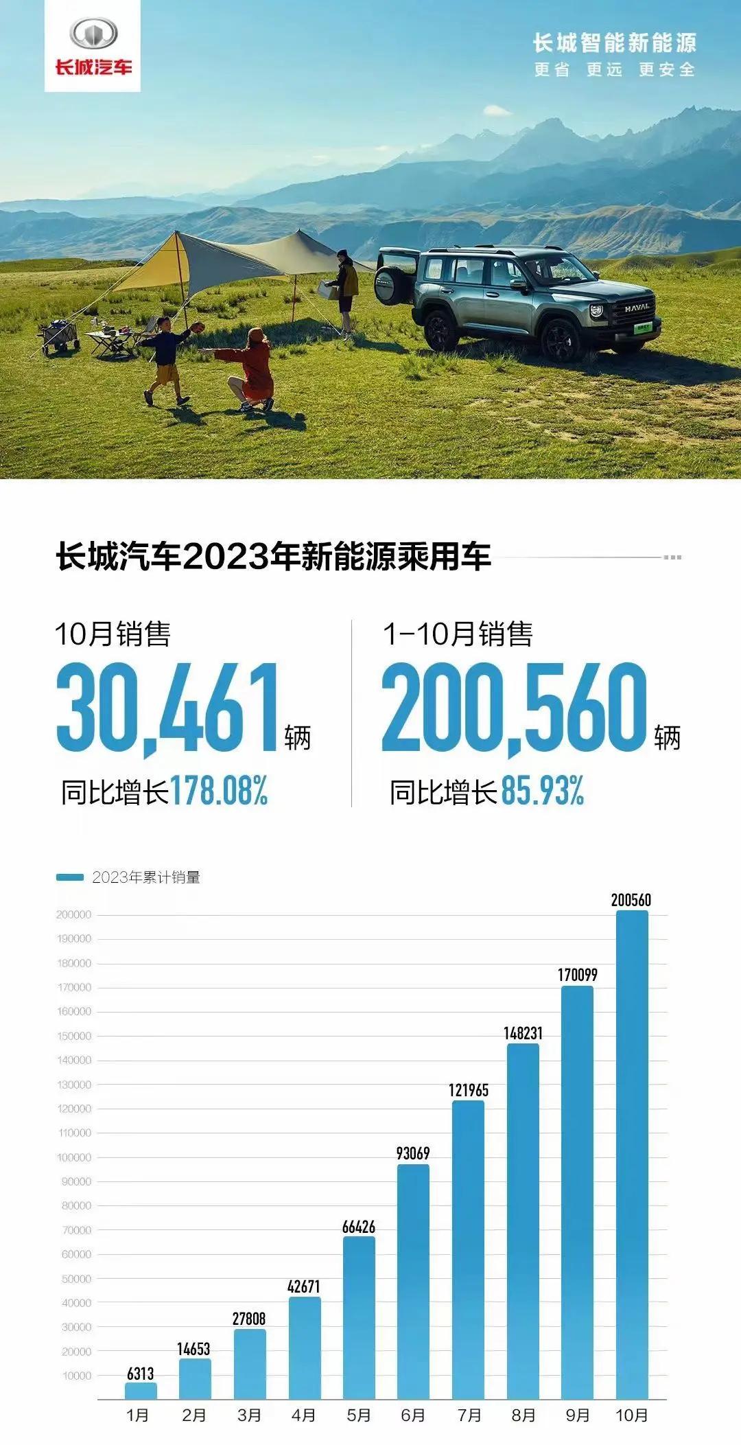 长城汽车发布的数据显示,10月份新能源汽车销量为30461辆,同比增长178%,而今年1至10月的累计销量超过20万辆,同比增长89.53%。长城汽车在新能源领域取得了一定的成果。