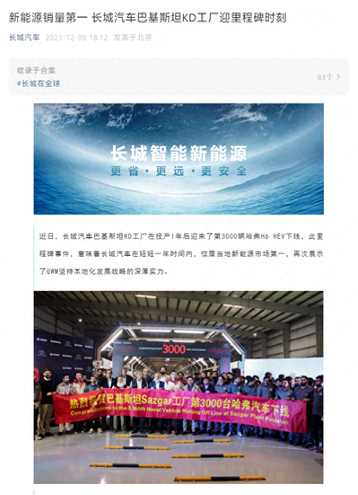 IT之家 12 月 10 日消息,据长城汽车官方公众号,近日长城汽车巴基斯坦 KD 工厂在投产一年后,迎来第 3000 辆哈弗 H6 HEV 车型下线,实现当地新能源车市场份额第一的“里程碑”。