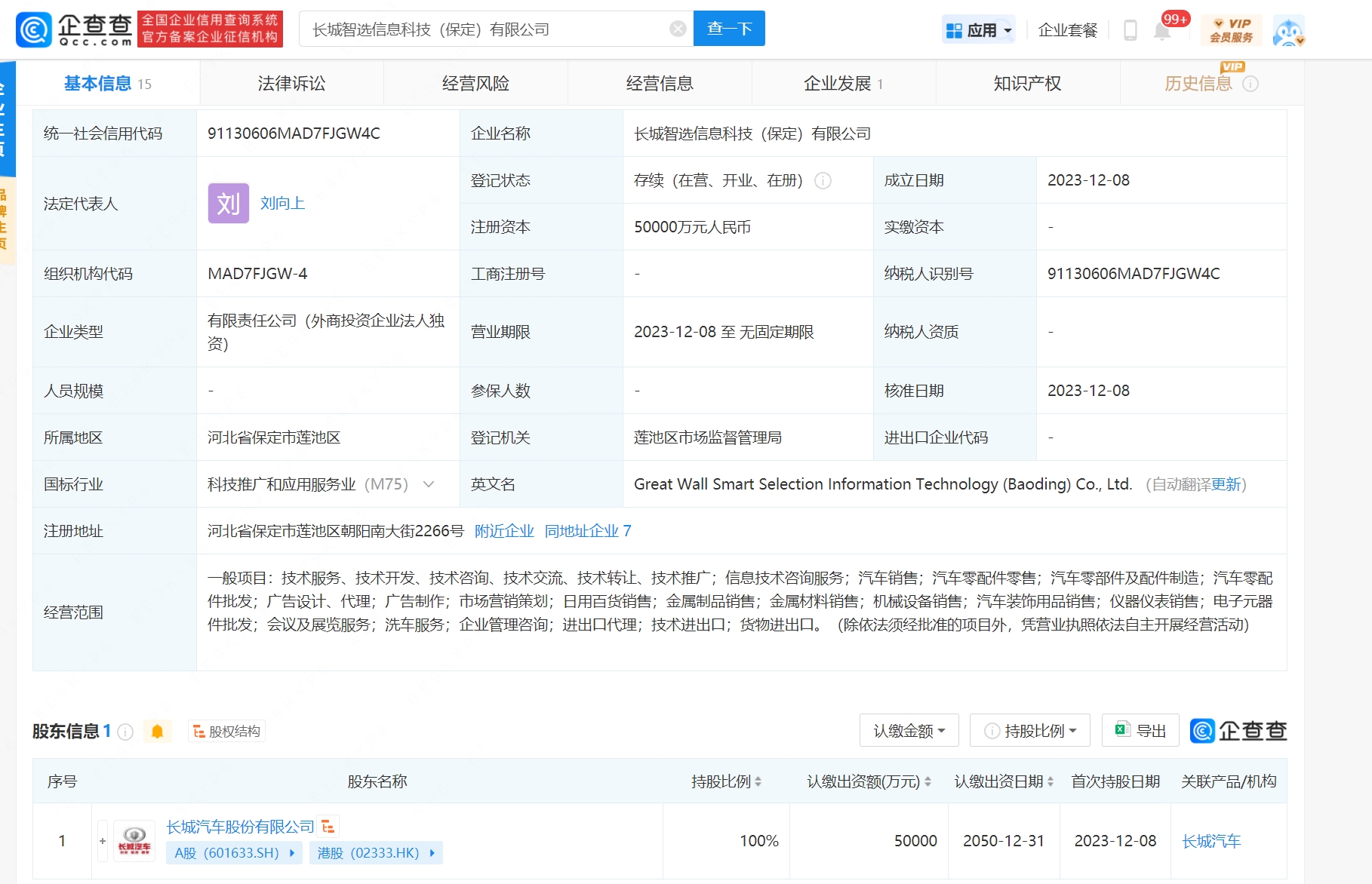 近日,长城智选信息科技(保定)有限公司成立,注册资本5亿元人民币,经营范围涵盖:汽车销售;汽车零配件零售;汽车零部件及配件制造;零配件批发等。股权穿透显示,该公司由长城汽车100%控股。(每日经济新闻)