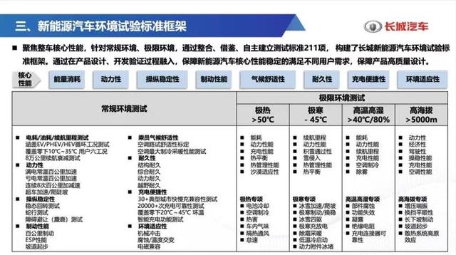 长城汽车基于33年造车积淀,通过整合、借鉴、自主建立测试标准200多项,构建了完整的新能源汽车环境测试、验证体系。长城汽车的测试体系聚焦整车核心性能,涉及能耗、动力、操稳、充电、乘员舱气候以及环境适用性等多重维度,贴合全球用户实际用车环境,不仅覆盖常规环境测试,而且覆盖极热、极寒、高温高湿以及高海拔等极限环境测试和验证,真正实现温度、湿度、海拔全环境要素的全覆盖。