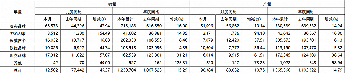 长城汽车1月3日公告,2023年销量123.07万辆,同比上涨15.29%;公司12月销量11.25万辆,同比上涨45.27%。
