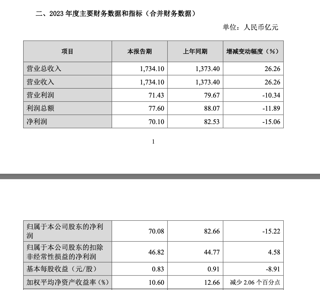 报告显示,2023年长城汽车实现营业收入1734.1亿元,同比增长26.26%;归属于公司股东的净利润70.08亿元,同比下降15.22%;扣非归母净利润46.82亿元,同比增长4.58%;基本每股收益0.83元,同比下跌8.91%。