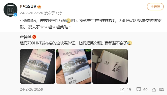 2月26日,长城汽车旗下坦克700Hi4-T正式上市,不少媒体和博主都前去参加了这场发布会。粉丝数超过340万的资深汽车达人吴佩也受邀前往,不过他发现,坦克700Hi-T发布会的媒体证上疑似写错英文。