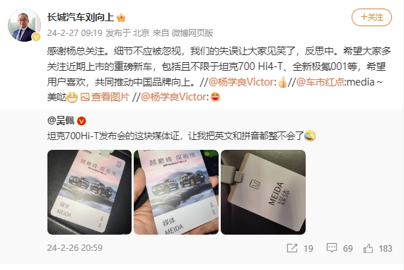 长城汽车股份有限公司副总裁刘向上转发杨学良的回应称:感谢杨总关注。细节不应被忽视,我们的失误让大家见笑了,反思中。希望大家多关注近期上市的重磅新车,包括且不限于坦克700Hi4-T、全新极氪001等,希望用户喜欢,共同推动中国品牌向上。