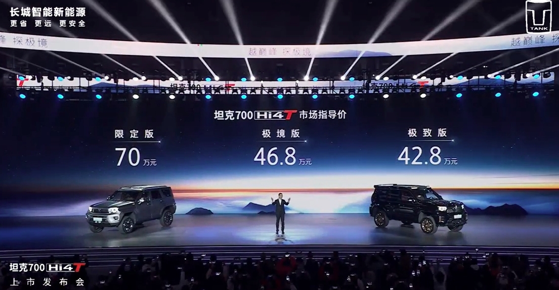 据介绍,在此次发布会上亮相的坦克700Hi4-T搭载了3.0THi4-T技术架构,综合功率385kW,综合扭矩800N·m,可提供5秒级零百加速体验,搭载了百万级主动悬挂,通过空气弹簧与CDC电磁减振器的组合,达到车身高度可调,悬架软硬可调。坦克700Hi4-T共提供三个版本,其中极致版建议零售价42.8万元、极境版46.9万元,限定版70万元。