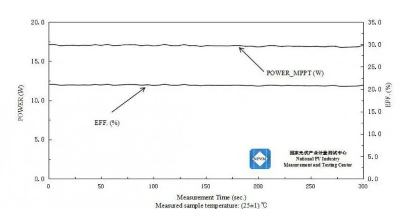 上图为被测样品最大功率稳态输出的功率-效率曲线,表明在300s连续稳态测试中组件效率波动低,输出功率稳定
