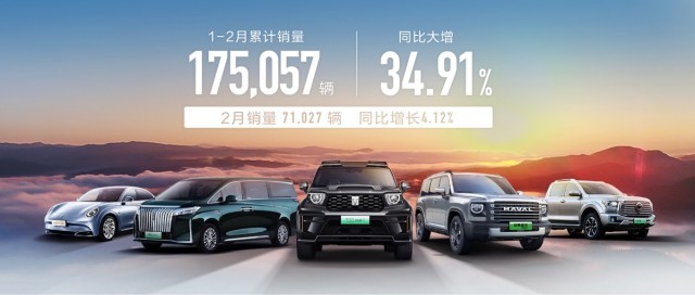 今年1-2月,长城汽车累计销量175,057辆,同比上涨34.91%。其中,新能源销量37,300辆,海外销量56,963辆,同比分别提升154.10%和91.91%。