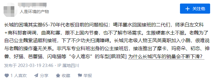 有网友称:“老魏为了自己公主魏紫涵顺利接班,下了不少功夫扫清障碍。长城元老级人物王凤英离职加入小鹏,很难说与老魏的操作毫无关系。”