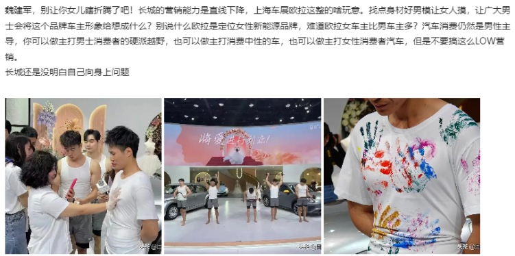 2023年上海车展上,长城汽车又因在展位找了一堆身材好的男模让女人摸,令网友疑惑:“如此下去,会不会变成海王女专车?”