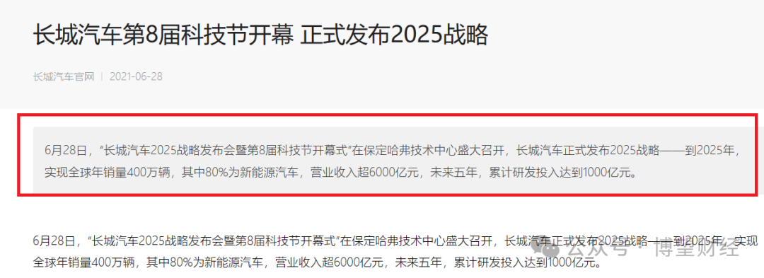 为了扭转这个局势,2021年6月,长城汽车发布了2025战略,提到2025年要实现全年销量400万辆,其中80%是新能源汽车,营业收入超过6000亿。同时,针对此计划安排未来五年累计研发投入达到1000亿的目标。