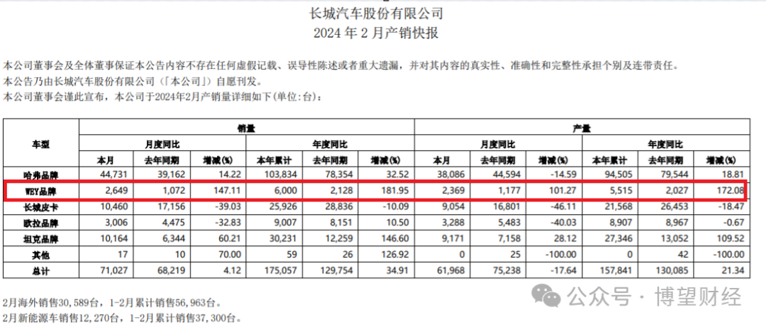 在新能源汽车的浪潮之下,2023年,长城汽车123万辆的销量排在比亚迪、奇瑞和吉利之后,且和前三家国产自主品牌企业的销量正在逐渐拉大。尤其是比亚迪,2023年的销量达到302万辆,即使是第三名的吉利,也有168万辆,这其中长城被拉开差距最重要的原因就是新能源车潮没有赶上国内的步伐,例如2024年的前两个月,长城汽车新能源销量合计仅为3.73万辆,占总销量的比例也只有21.31%。