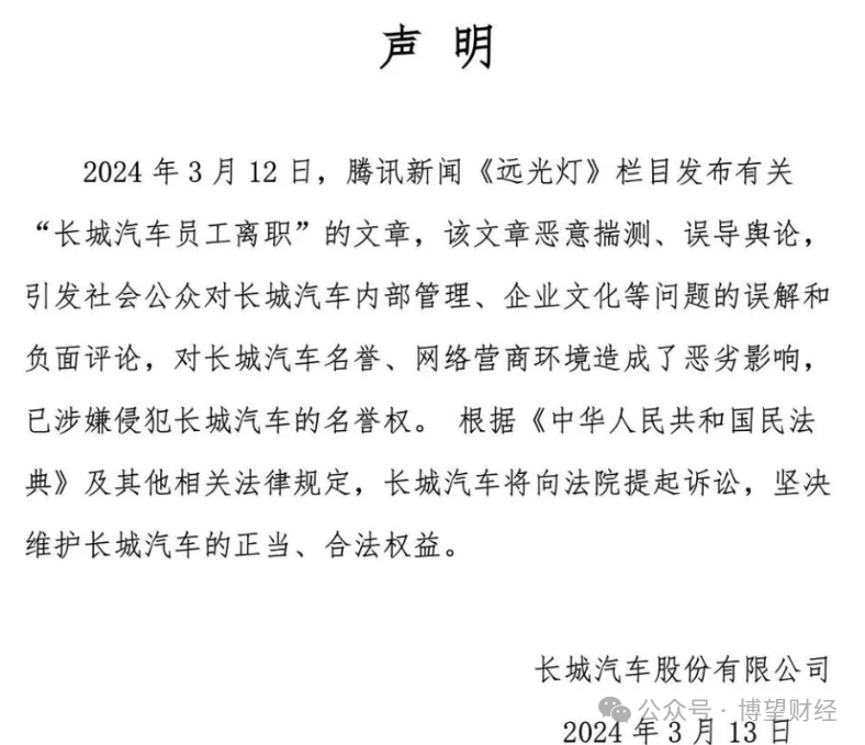 而就在最近,长城汽车还在就员工离职问题和媒体节目打起了嘴仗,腾讯新闻在3月12日得《远光灯》栏目中发表了一篇关于长城汽车员工离职的文章,虽然这当中大部分都是事实,但也有部分放大负面信息误导舆论的嫌疑。随后长城汽车连夜发表声明,并向法院提起诉讼维护自己的权益。