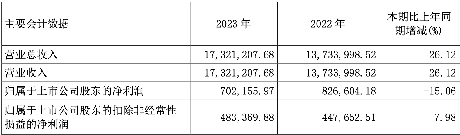 3月28日,长城汽车股份有限公司(长城汽车,601633)发布的2023年财报显示,长城汽车2023年实现营业总收入1732.12亿元,同比增长26.12%;归母净利润70.22亿元,同比下降15.06%;毛利率为18.73%,较2022年下滑了0.64个百分点。基本每股收益0.82元。