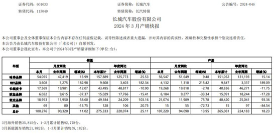 截取自长城汽车2024年3月产销快报