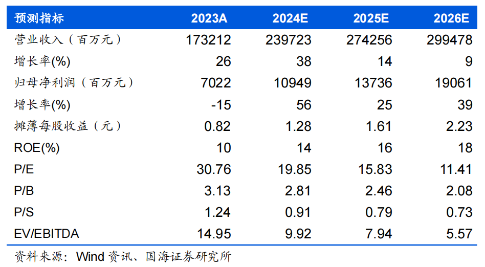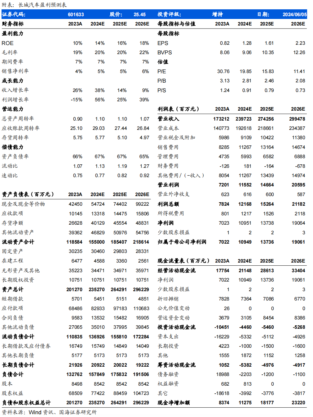公司销量虽然短期出现波动,但展望未来,新车型及智能化产品推出有望提振整体销量,预计公司2024-2026年实现营业收入2397、2743、2995亿元,同比增速为38%、14%、9%;实现归母净利润109.5、137.4、190.6亿元,同比增速为56%、25%、39%;EPS 为1.28、1.61、2.23元,对应当前股价的PE估值分别为19.9、15.8、11.4倍。我们预计公司未来收入等业绩指标持续向好,看好公司未来发展,维持“增持”评级。