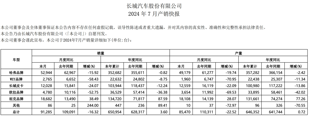 8月1日,长城汽车对外公布7月产销快报。数据显示,7月长城汽车销量9.13万辆,同比下滑16.32%,连续三个月销量同比下滑。1-7月累计销量65.10万辆,同比增长3.60%。其中,7月海外销量3.82万辆,1-7月累计销量23.97万辆。7月新能源汽车销量2.41万辆,1-7月累计销量15.65万辆。相对于年初定下的全年160万辆的销量目标,长城汽车仅完成40%,实现难度较大。