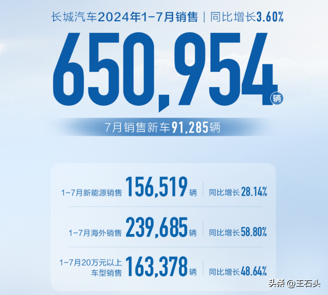 长城汽车公布的销售战报能够非常直观的体现出来,2024年前7个月约65.1万辆销量,其中海外市场占到了约24万辆,占总销量的约37%。