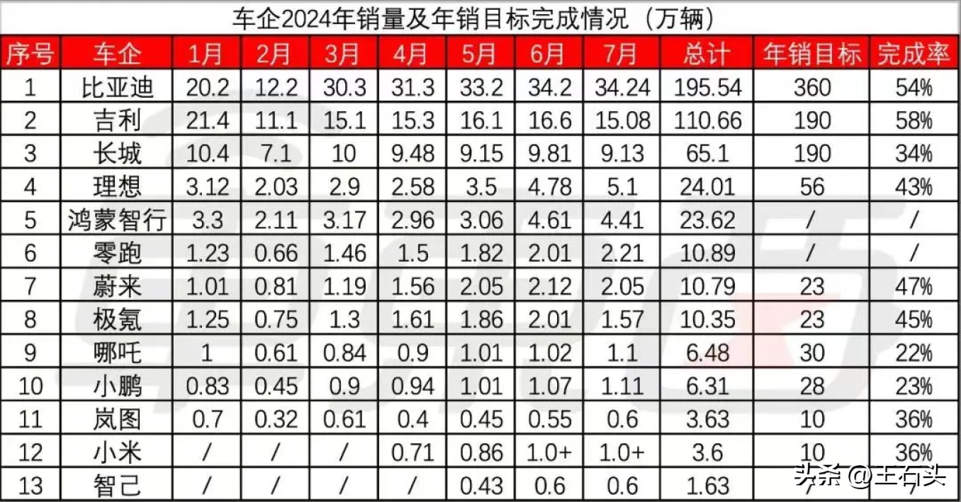 从这份车企2024年销量及销量目标完成情况可以看出,长城在今年前7个月的合计销量只有65.1万辆,而长城定下的全年销售目标是190万辆。