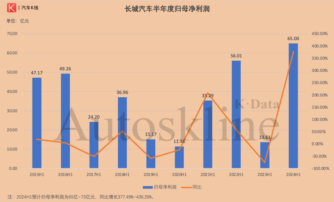 业绩预告显示,长城汽车上半年预计实现归母净利润65亿~73亿元,同比大增377.49%~436.26%,创历史新高。