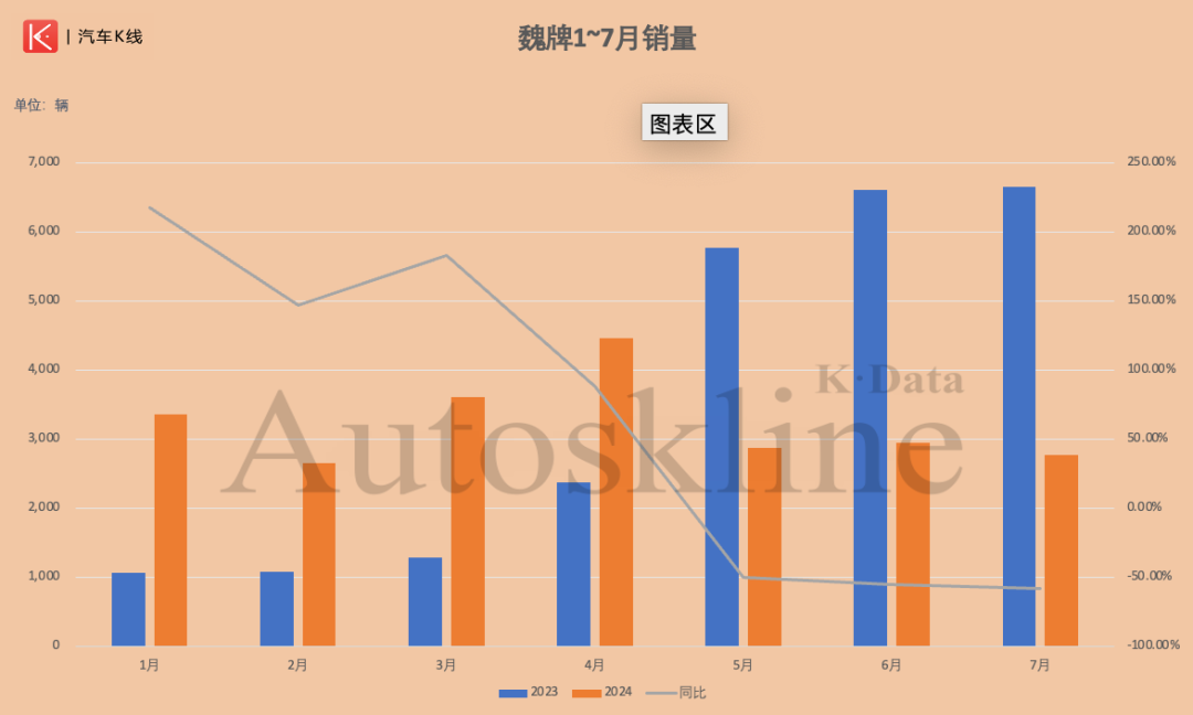 7月,魏牌仅销售2765辆,同比下滑58.43%,是长城汽车同比下滑最严重的品牌。
