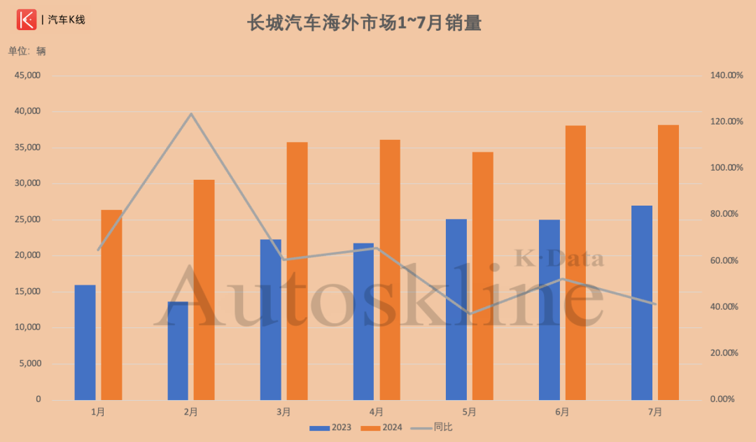 7月,长城汽车海外销量为3.82万辆,同环比分别增长41.39%、0.21%,创海外销量历史新高。