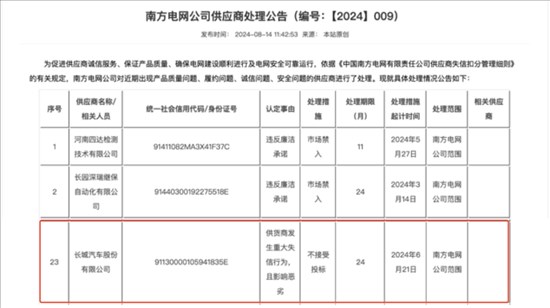公告显示,长城汽车股份有限公司被认定为“供货商发生重大失信行为,且影响恶劣”。南方电网给予长城汽车“不接受投标”的处理措施,处理期限为24个月,处理措施起计时间为2024年6月21日,处理范围为“南方电网公司范围”。
