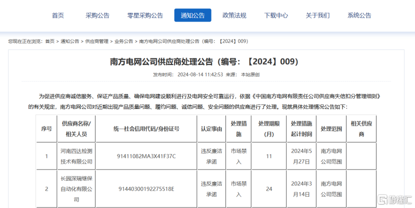 8月14日,南方电网供应链统一服务平台发布《南方电网发布供应商处理公告(【2024】009)》。公告指出,南方电网公司对近期出现产品质量问题、履约问题、诚信问题、安全问题的供应商进行了处理,并将具体处理情况予以公布。