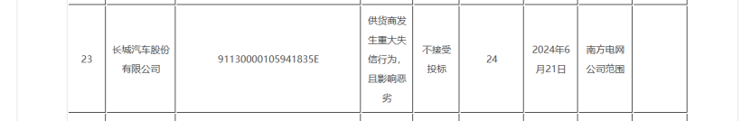 其中,长城汽车股份有限公司因供货商发生重大失信行为,且影响恶劣,被采取“不接受招标”的处理措施,从2024年6月21日开始处理,处理期限为24个月。