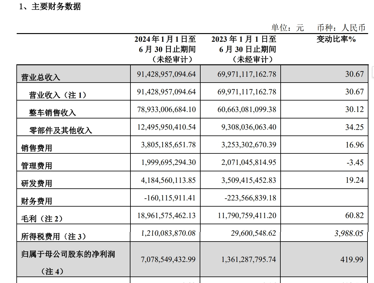 8月29日,长城汽车(SH601633,股价22.31元,市值1905.8亿元)披露半年报,2024年上半年实现营业收入914.29亿元,同比增长30.67%;净利润70.79亿元,同比增长419.99%;基本每股收益0.83元。报告期内,公司实现海外销售增长、国内产品结构进一步优化,带动净利润同比大幅增长。