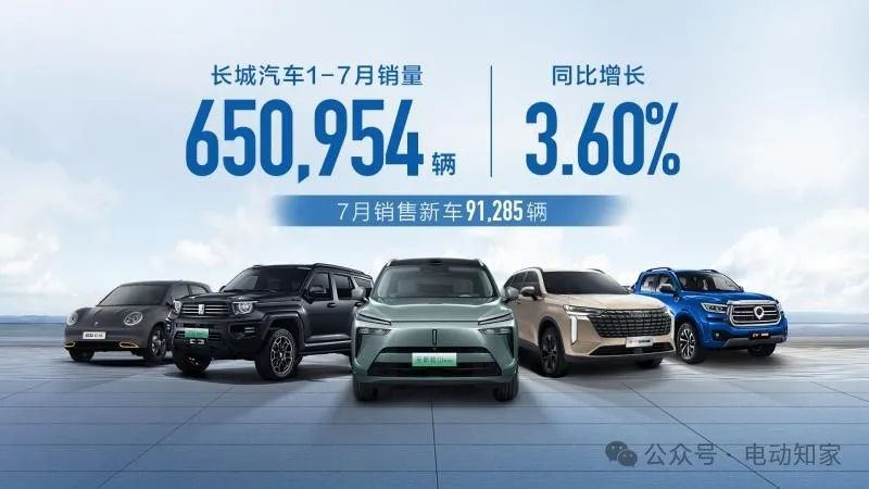 1-7月,长城汽车累计销售650,954辆,同比增长3.60%。其中,新能源车型销售156,519辆,同比增长28.14%;海外销售239,685辆,同比增长58.80%;20万元以上车型销售163,378辆,同比增长48.64%。