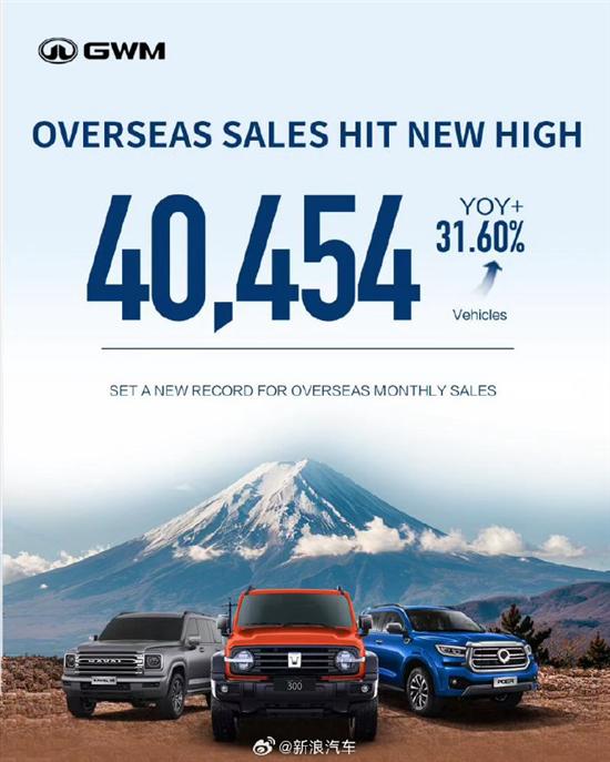 9月6日消息,长城汽车今天通过官方新闻稿宣布,8月海外销量达到40454辆,同比增长31.6%,创下海外单月销量的新纪录。今年 1-8月,长城汽车海外销量累计达到280139辆,同比增长54.2%。