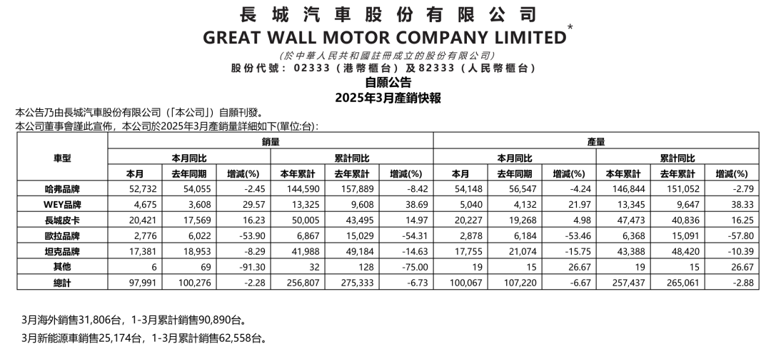 作为中国民营车企之一,截至目前,长城汽车旗下拥有哈弗、魏牌、坦克、欧拉、长城皮卡五大品牌。官方数据显示,2025年一季度长城汽车累计销量为256807辆,同比下滑6.73%。其中,新能源车累计销量为62558辆;海外市场累计销量为90890辆。从今年前3月销量情况来看,长城汽车与比亚迪、奇瑞、吉利等车企相比还是有所差距。
