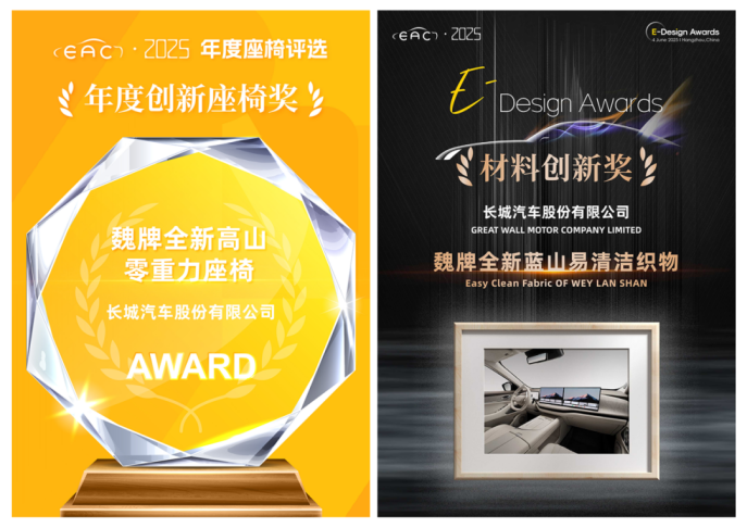 在2025年杭州EAC汽车产业大会上,长城汽车再度成为行业关注的焦点。其旗下魏牌全新高山与全新蓝山两款车型,分别凭借“零重力座椅”和“易清洁织物”技术,将“年度创新座椅奖”及“材料创新奖”两项荣誉收入囊中,这标志着长城汽车在高端新能源领域的技术实力得到了权威层面的认可。
