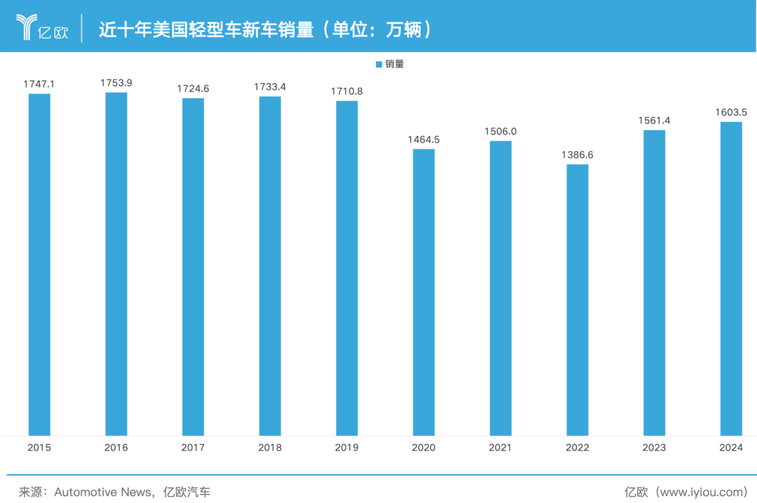 Automotive News数据显示,2024年美国轻型车新车市场总销量为1603.5万辆,同比增长2.5%。这是自2019年之后该市场又一次达到1600万辆以上。
