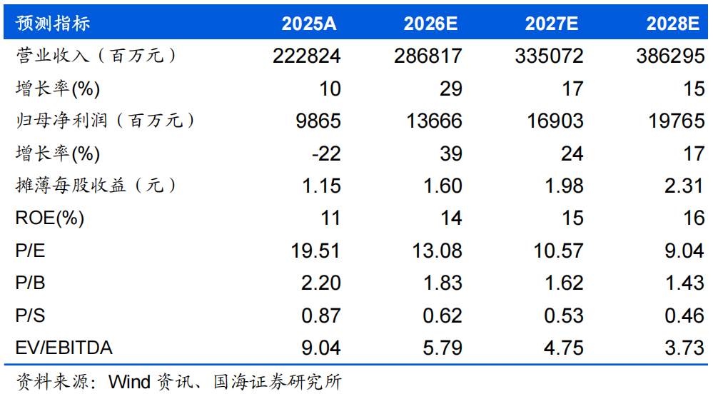 公司海外竞争优势稳固,盈利确定性较高,随未来产品推出,公司销量整体趋势向上,预计公司2026-2028年实现营业收入2868、3351、3863亿元,同比增速为29%、17%、15%;实现归母净利润136.7、169.0、197.7亿元,同比增速为39%、24%、17%;EPS 为1.60、1.98、2.31元,对应当前股价的PE估值分别为13.08、10.57、9.04倍。我们预计公司未来收入等业绩指标持续向好,看好公司未来发展,维持“增持”评级。
