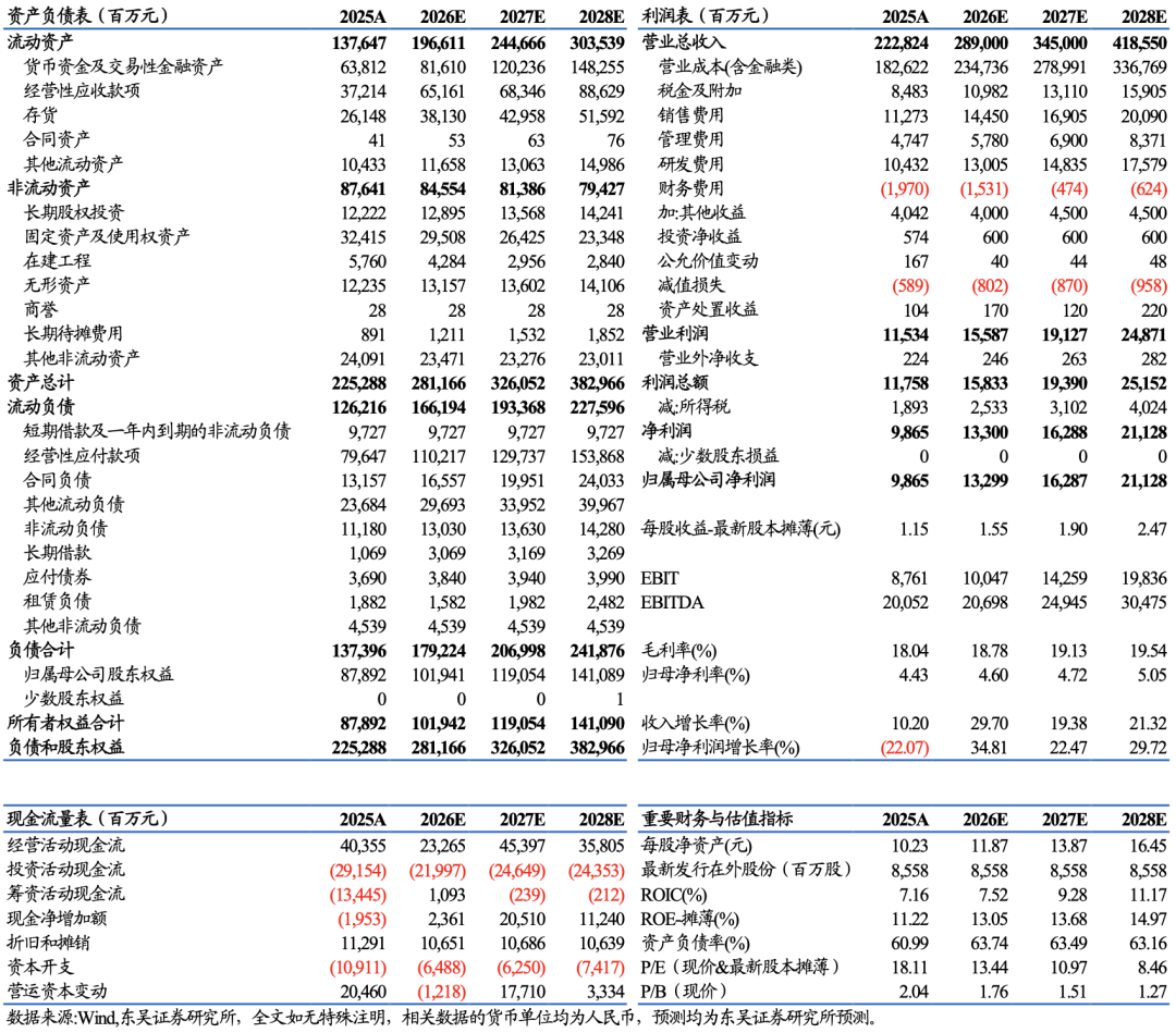 公司公告2025年营收2228.2亿元,同比+10.2%,归母净利润98.7亿元,同比-22.1%,扣非后归母净利润60.6亿元,同比-37.5%。2025Q4公司实现营收 692亿元,同环比+16%/+13%;实现归母净利润12.3亿元,同环比-46%/-46%;实现扣非后归母净利润5.8亿元,同环比分别-57%/-69%。